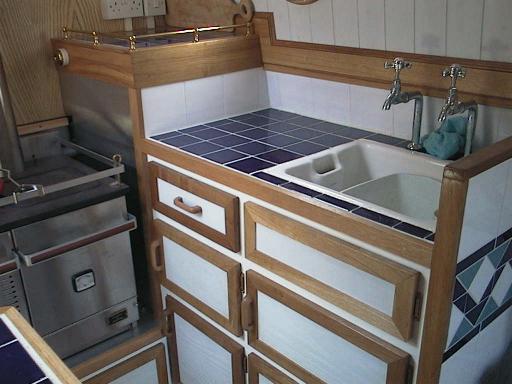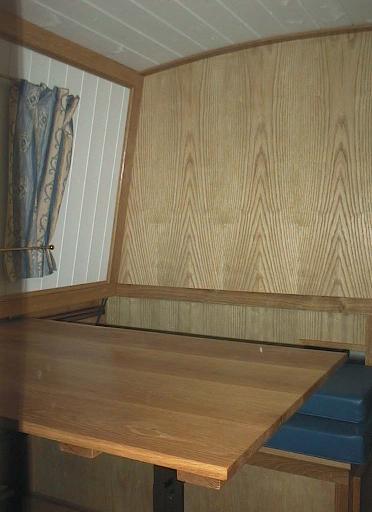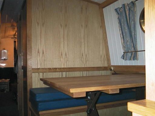 The detailing for the fit out of the main part of the boat is light blue painted tongue and grove boarding with European oak for the framing above the gunnel and tongue and groove beech boarding below the gunnel. |