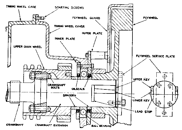 *81. FLYWHEEL. (K Engine)--The attachment of the flywheel is important. If it is necessary to remove it, draw the bolts by means of the puller and stud in the tool box. These bolts must be oiled and replaced with care, as a loose flywheel may involve a new crankshaft.