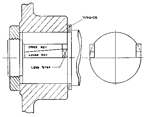 105. TO REPLACE THE FLYWHEEL.--Set the lead stops (spares in tool box) into the shaft and slip the spacer over them. Mount the flywheel. Insert the keys loosely. Draw on the flywheel by means of the service plate then tighten the upper keys.